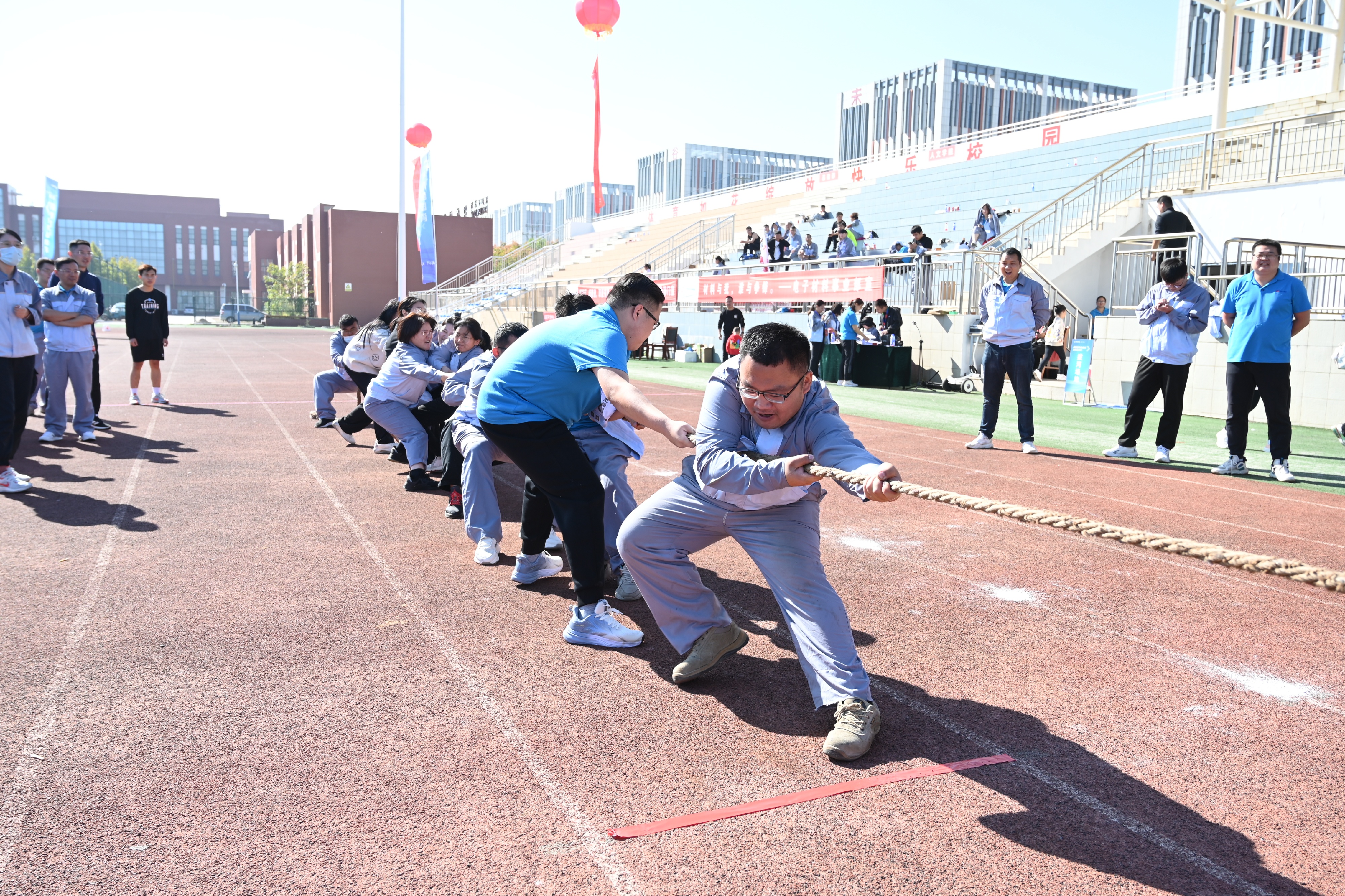 本届运动会设置篮球、足球循环积分赛,乒乓球、羽毛球男单、女单、混双赛,还有实心球、定点投篮、立定跳远、一分钟跳绳、4×100 米接力赛、拔河、摸石过河、巨人的脚步等,历时14天,100多场次比赛。